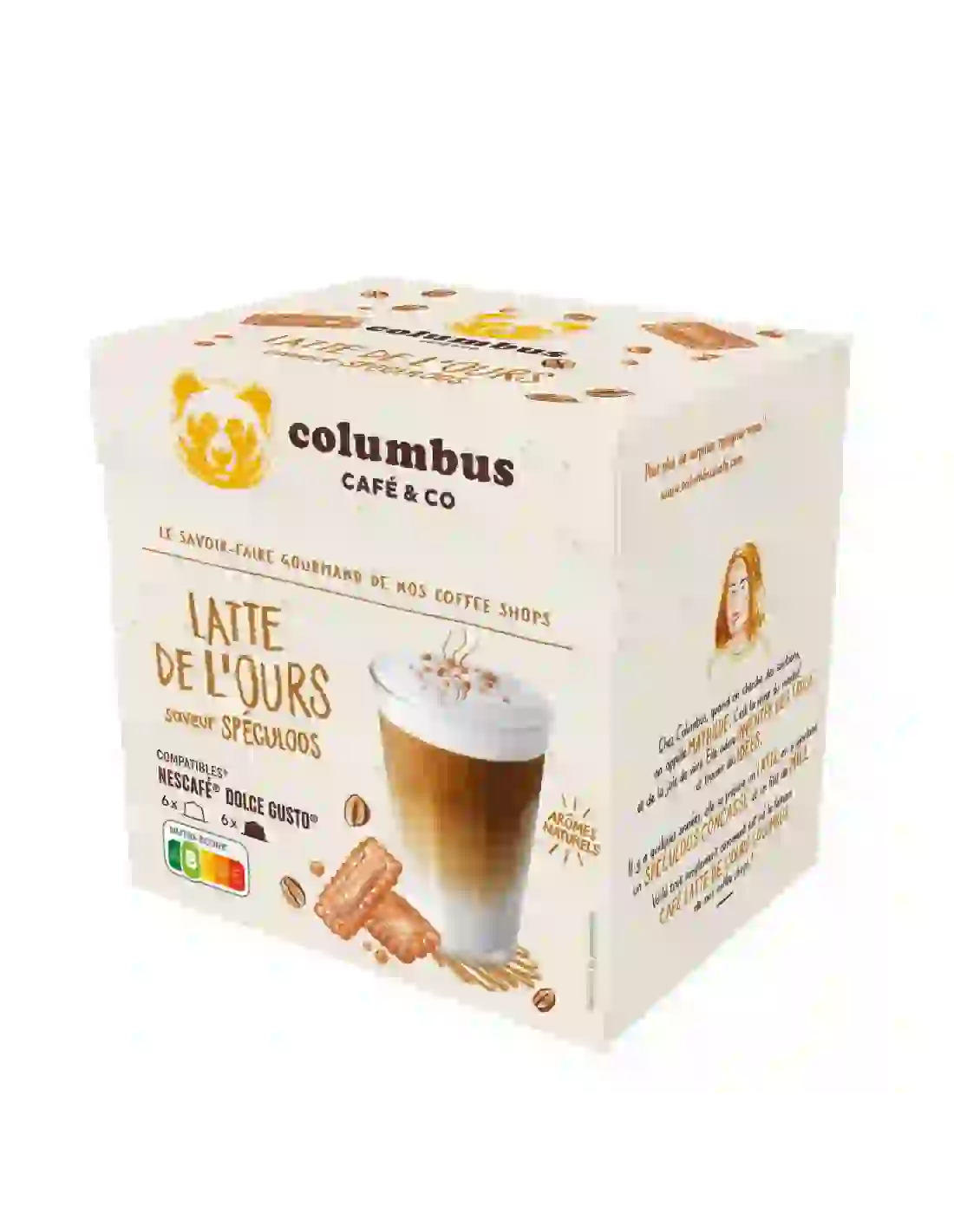 Cette boisson mythique des salons Columbus a été créée par Mathilde, une reine du market' et de la joie de vivre. Alors qu'elle cherche de nouvelles saveurs pour son café, elle décide d'y ajouter un spéculoos concassé et un filet de miel. La recette est née et elle se répandra alors dans les coffee shops de la marque.