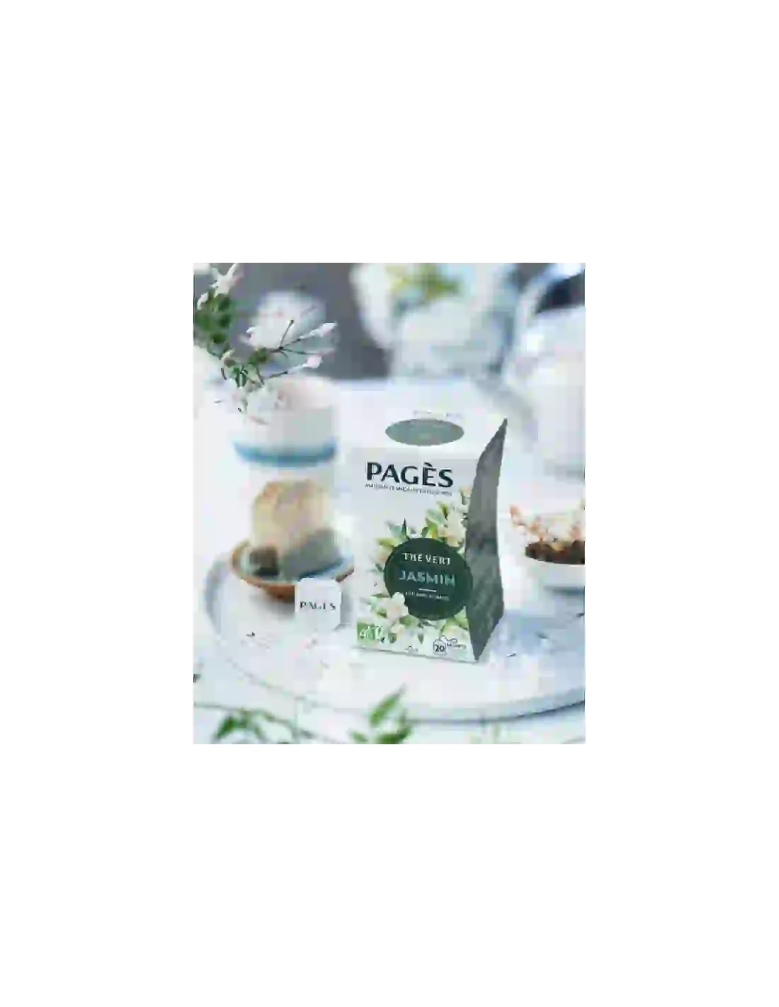 Thé vert Saveur Jasmin Pagès en 20 sachets, délicatement parfumé aux fleurs de jasmin. Infusion florale, douce et élégante, idéale pour une pause thé raffinée au quotidien, à la maison ou au bureau.